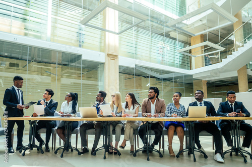 team work group of international business partners : indian,korean, afro-american people working together in modern room - Buy this stock photo and explore similar images at Adobe Stock | Adobe Stock